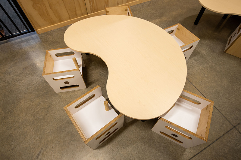 One of the unique aspects of KidsZone Stratford is it’s very natural, quality feel, thanks to the plywood interior walls. This gave the Play’n’Learn team a great opportunity to develop custom furniture, as well a tailor some existing ranges to best compliment the natural atmosphere.